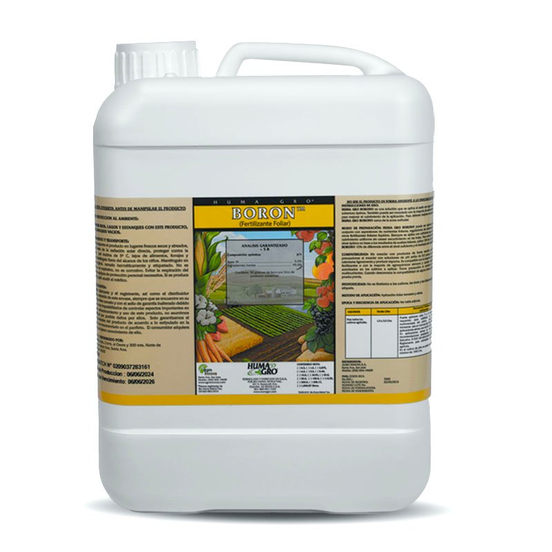 BORON™ es una formulación de nutrientes para suelos y foliar que es una fuente altamente estable y orgánicamente complejado de boro; sal buferizada y formulada para asegurar una máxima asimilación y translocación. Suministra el boro necesario para la actividad metabólica y propicia el crecimiento y maduración, mejora la calidad del cultivo, mejora el metabolismo de proteínas y reduce la acumulación de nitrato en hojas jóvenes, aumenta la viabilidad del polen y polinización en la floración, mejora la transportación de azúcares en la planta. Síntomas de deficiencias: tallo grande o raíz enmarañada, las hojas jóvenes se tornan descoloridas y mueren.