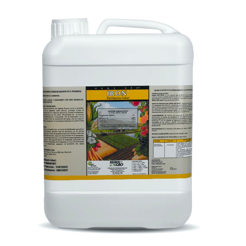 IRON™ es una formulación para suelos y foliar que es una fuente altamente estable y orgánicamente complejado de fierro; sal buferizada y formulada para asegurar una máxima asimilación y translocación. El fierro es requerido por las plantas para formación de clorofila, activa otros procesos bioquímicos como es la respiración, fijación simbiótica de nitrógeno y transferencia de energía en la planta. Existe deficiencias de fierro en suelos con altos niveles de nitrato, sobre irrigación, falta de drenaje o aireación, exceso de bicarbonato, calcio, magnesio y fosfato y con deficiencias de potasio y calcio.