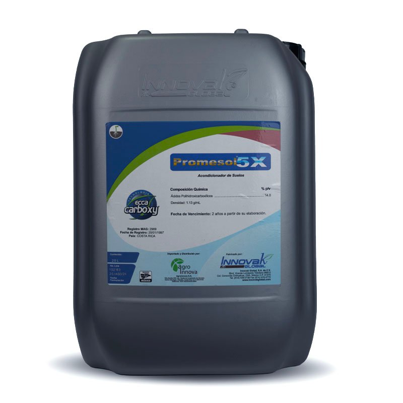 Promesol®5X es una formulación a base de extractos concentrados de cascarillas agrícolas ECCA Carboxy® que atrae partículas del suelo formando agregados que generan un buen balance de macro y micro poros, haciendo un suelo esponjoso de fácil laboreo.